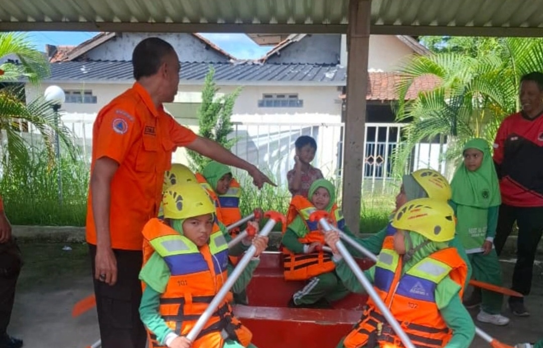 ​Para murid tampak antusias saat mencoba mendayung perahu karet di bawah instruksi petugas. Selain fokus pada evakuasi banjir, rangkaian pelatihan ini juga mencakup simulasi penyelamatan diri saat gempa bumi melalui pemutaran materi visual.
